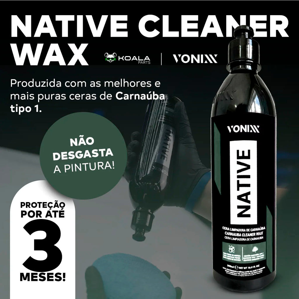 A Native Cleaner Wax da Vonixx une o poder de limpeza suave com o brilho quente e proteção natural da cera de carnaúba tipo 1. Produzida artesanalmente, oferece acabamento aveludado e proteção por até 3 meses em pinturas automotivas.